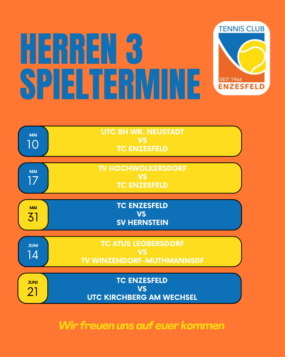Auch unsere Herren 3 haben ein straffes Programm vor sich. Während die ersten beiden Spieltage auswärts in Wiener Neustadt und Hochwolkersdorf stattfinden, können sich die Fans auf zwei Heimspiel-Sonntage freuen: Am 31. Mai empfangen wir den SV Hernstein und am 21. Juni den UTC Kirchberg am Wechsel zum Saisonabschluss.